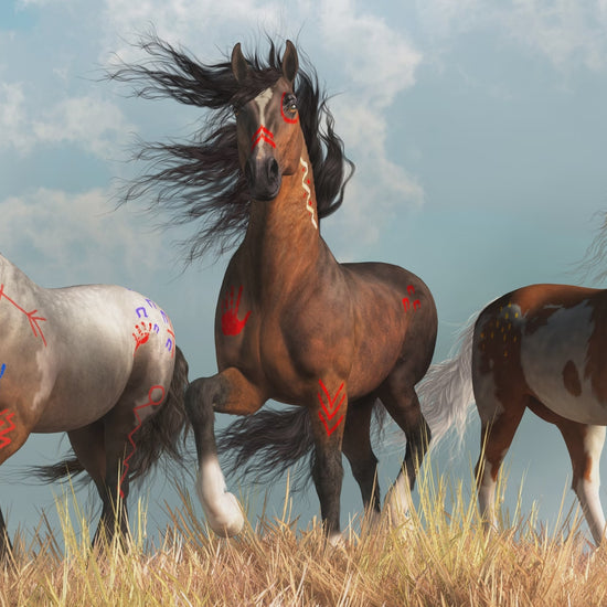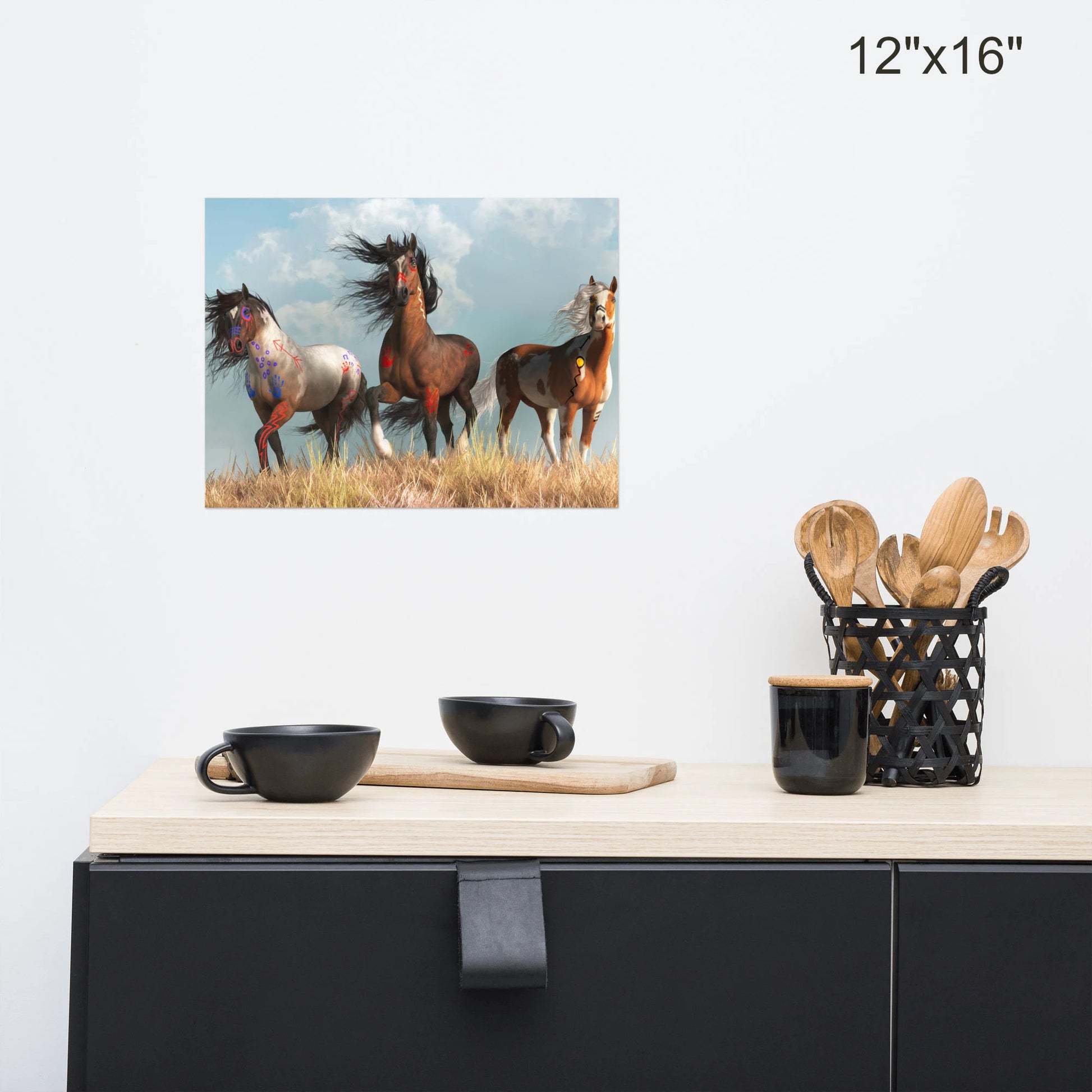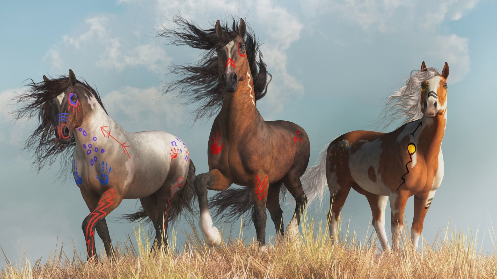 Three war horses stand in tall golden grass as the winds of the prairie blow through their manes and tails. Each Indian pony wears an array of colorful war paint. All three of them gaze intently at you the viewer. Behind them, puffy cumulus clouds rise in the sky in the afternoon heat of the American Wild West.