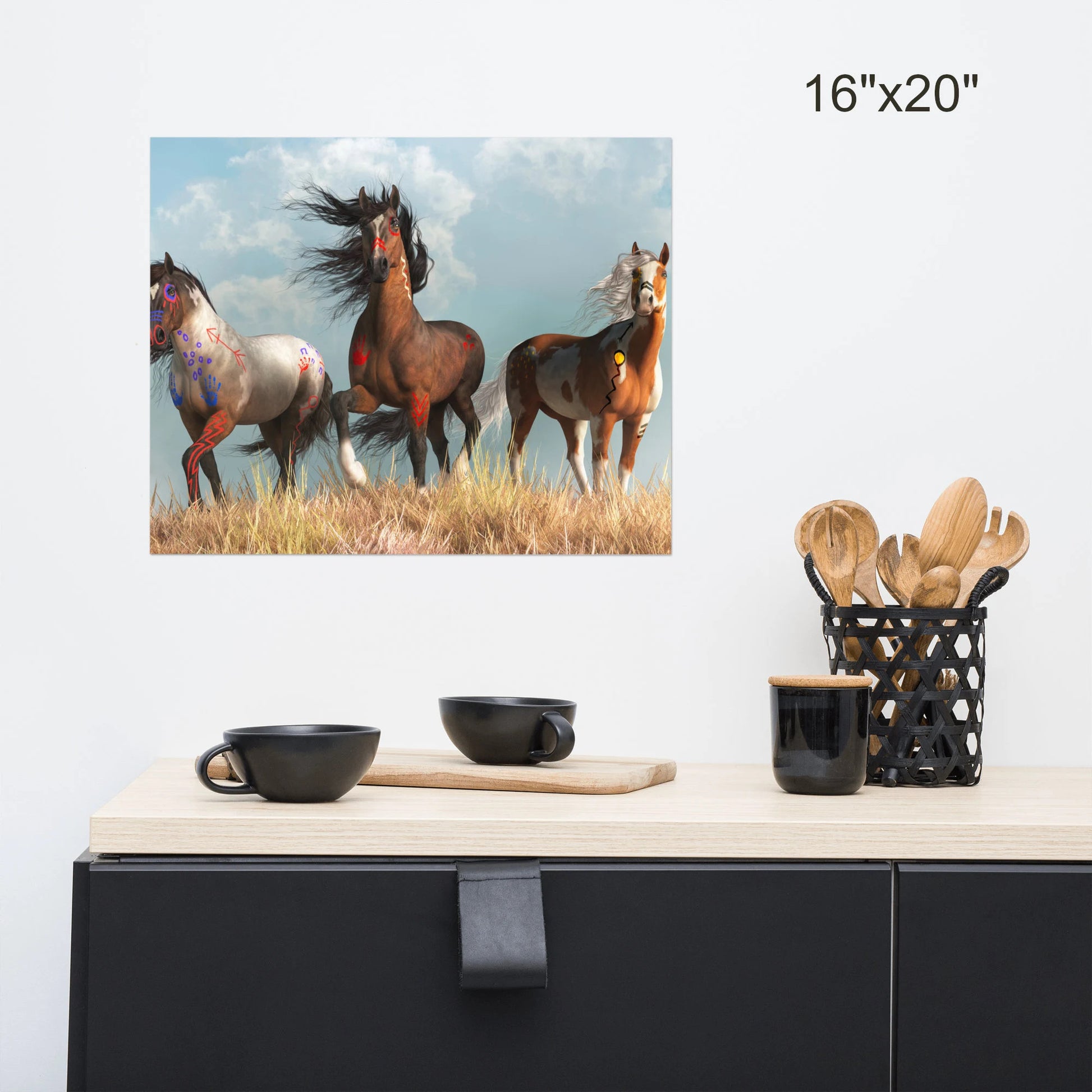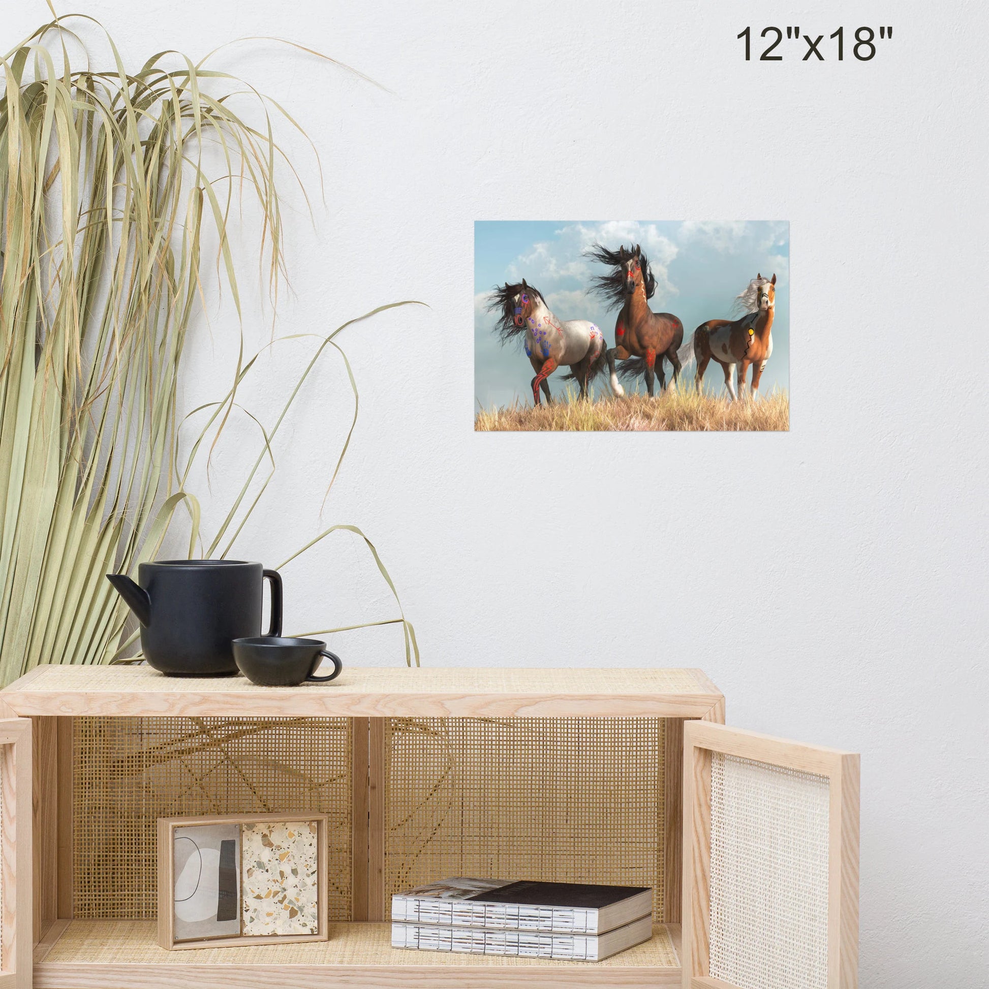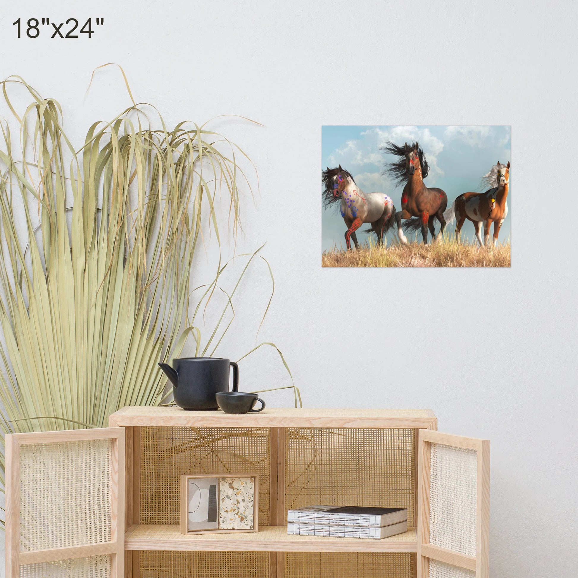 Three war horses stand in tall golden grass as the winds of the prairie blow through their manes and tails. Each Indian pony wears an array of colorful war paint. All three of them gaze intently at you the viewer. Behind them, puffy cumulus clouds rise in the sky in the afternoon heat of the American Wild West.