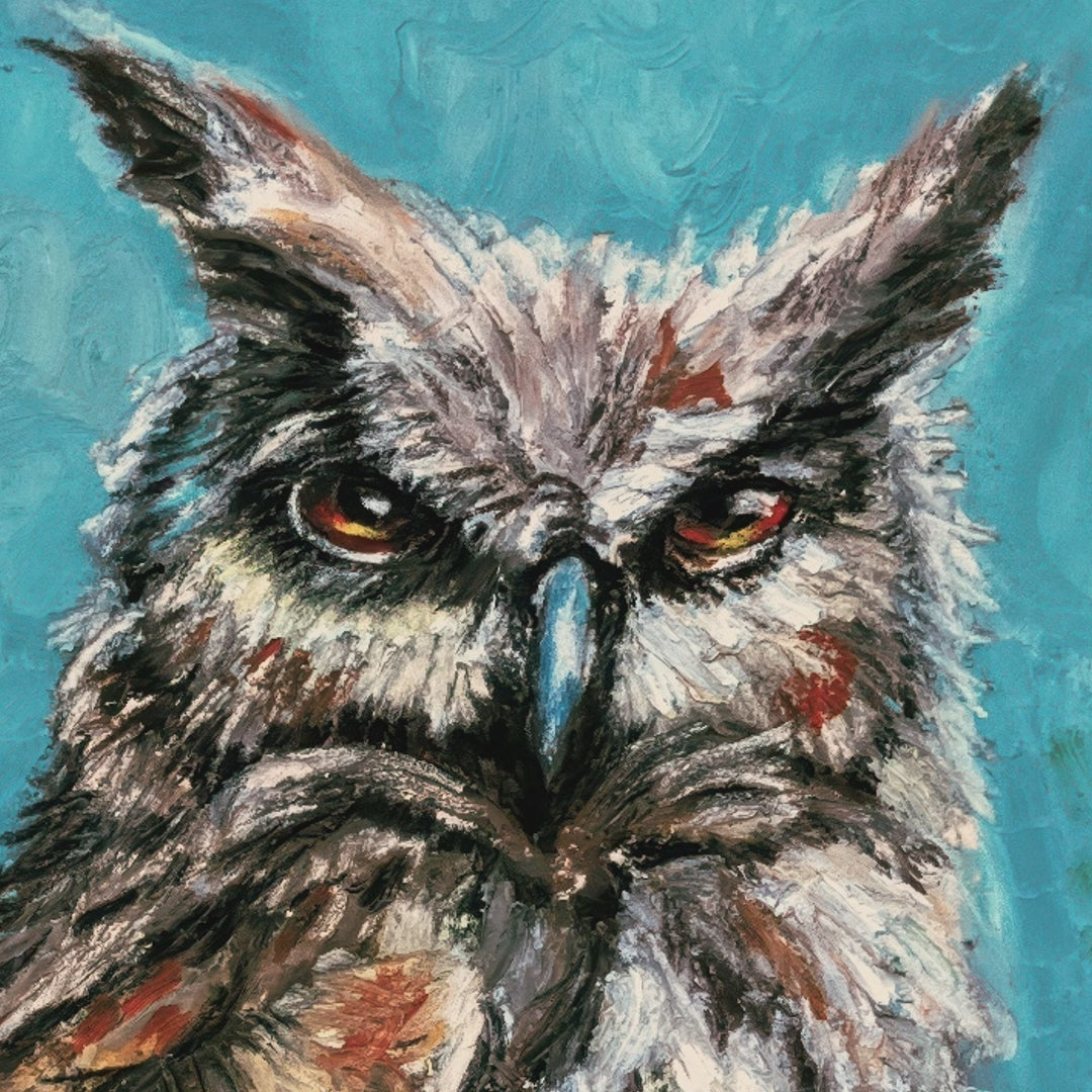Created with Sennelier oil pastels on UArt sanded paper, this 9" x 12" original artwork showcases the rich texture and expressive layering that only pastel can achieve. The background’s turquoise hues contrast beautifully with the owl’s earthy feathers, giving the piece a moody, woodland atmosphere.