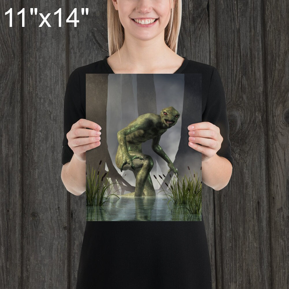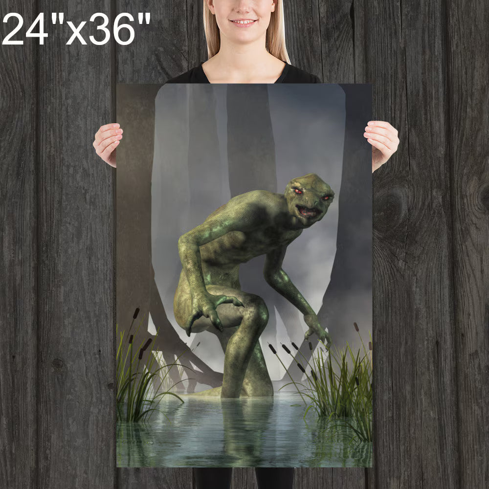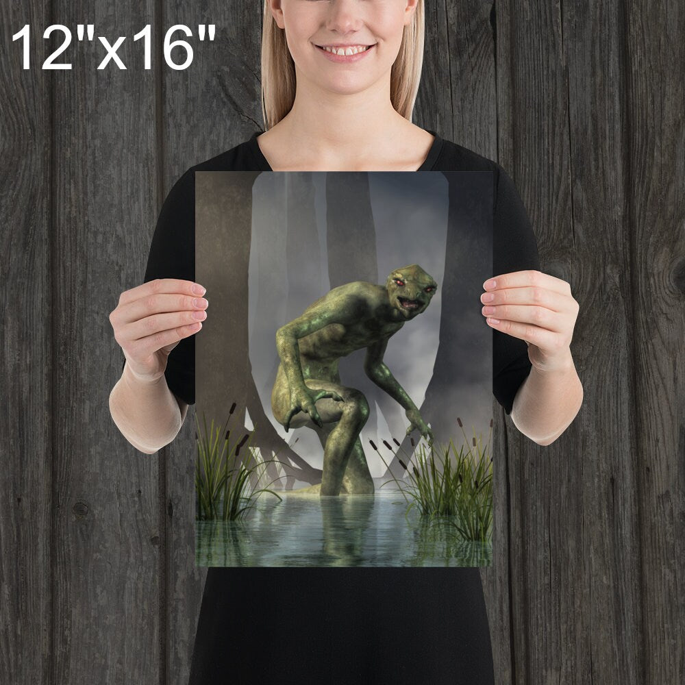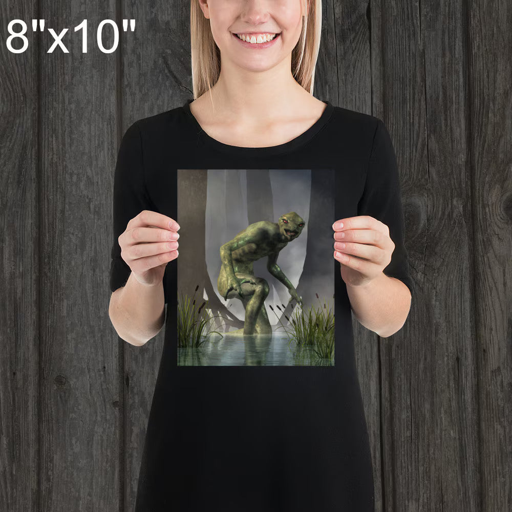 From the Artist: There are a couple of things I liked about making this image. First off, this is not your usual hairy man (like Bigfoot or a werewolf) nor a sea serpent making it different from the more common cryptids. It was a nice change of pace. Plus, the green skin was fun to work with. Also, I like this one as it is a bit more local. Usually creatures like bigfoot are said to haunt forests on the other side of the continent. Living on the highly populated East coast, cryptids are a bit more rare, yet this reptilian monster was sighted less than half a day's drive away from where I live.