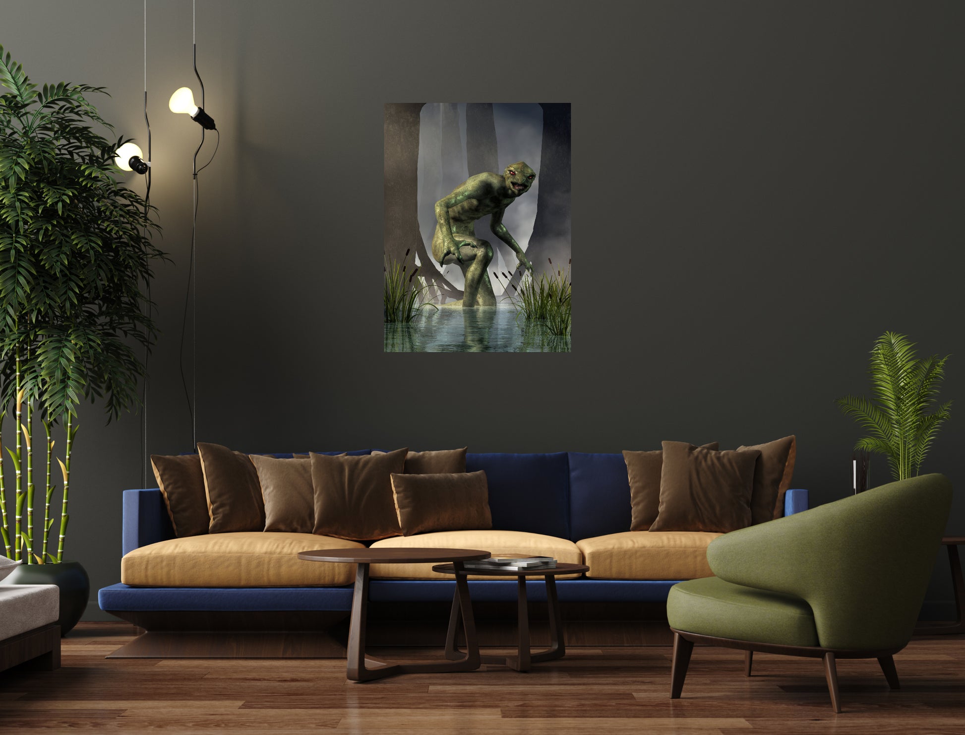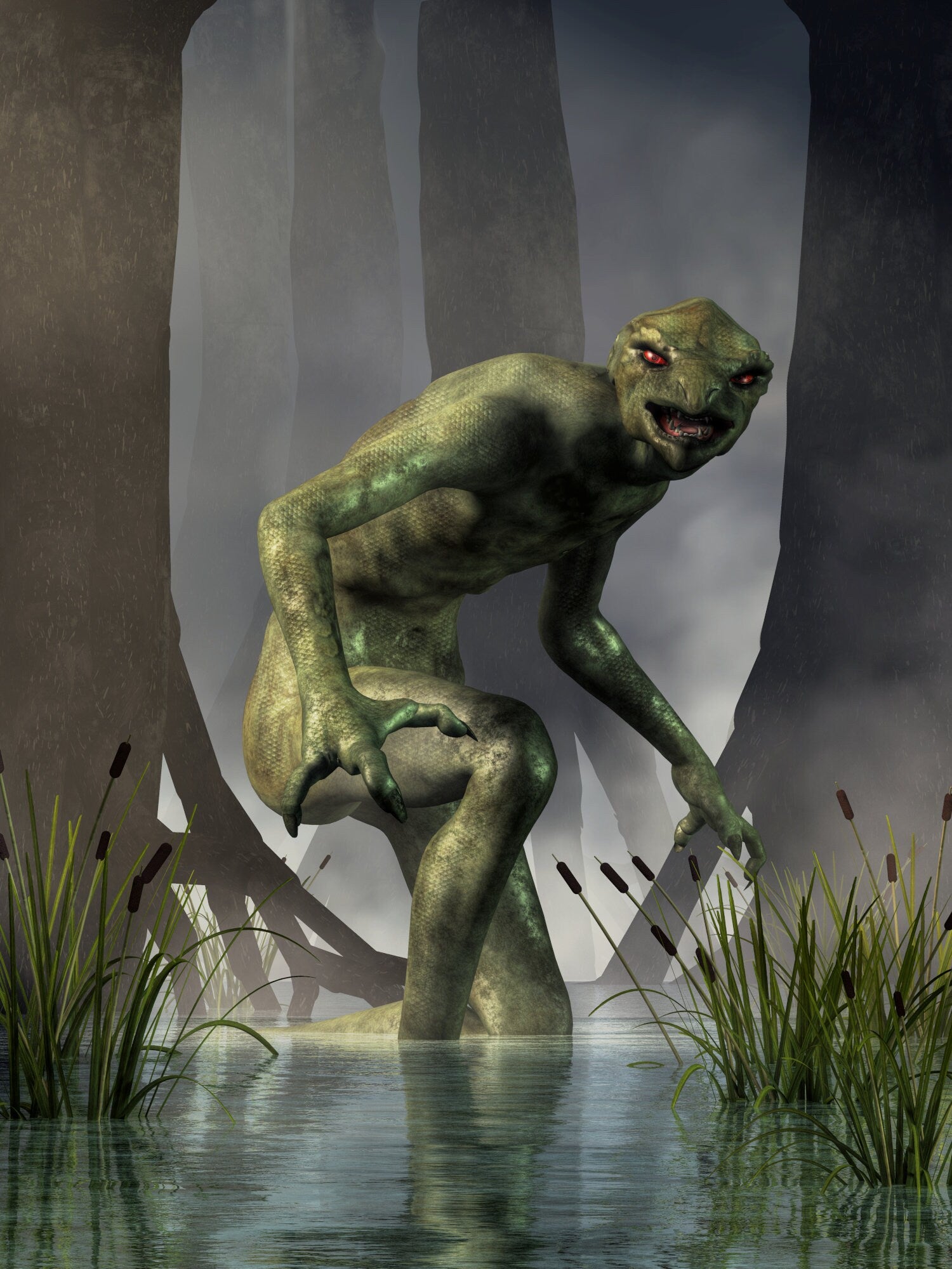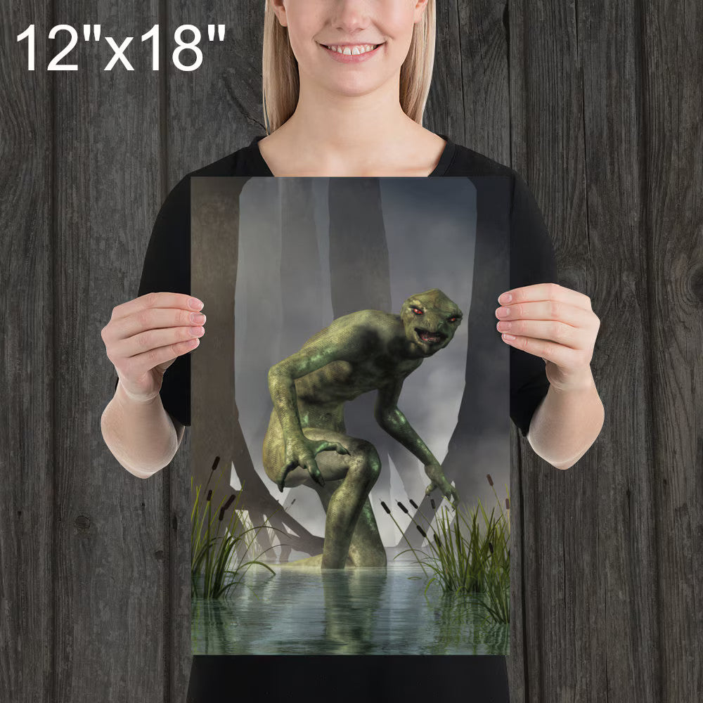 From the Artist: There are a couple of things I liked about making this image. First off, this is not your usual hairy man (like Bigfoot or a werewolf) nor a sea serpent making it different from the more common cryptids. It was a nice change of pace. Plus, the green skin was fun to work with. Also, I like this one as it is a bit more local. Usually creatures like bigfoot are said to haunt forests on the other side of the continent. Living on the highly populated East coast, cryptids are a bit more rare, yet this reptilian monster was sighted less than half a day's drive away from where I live.