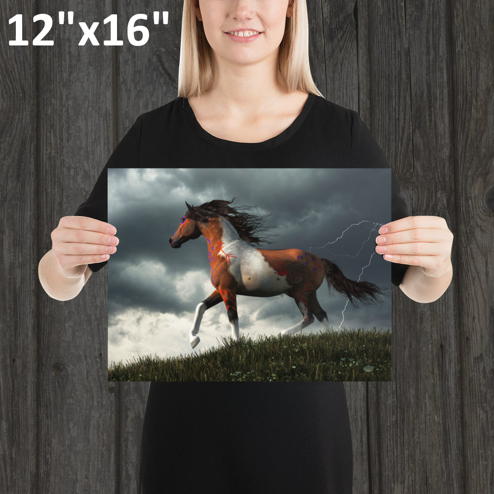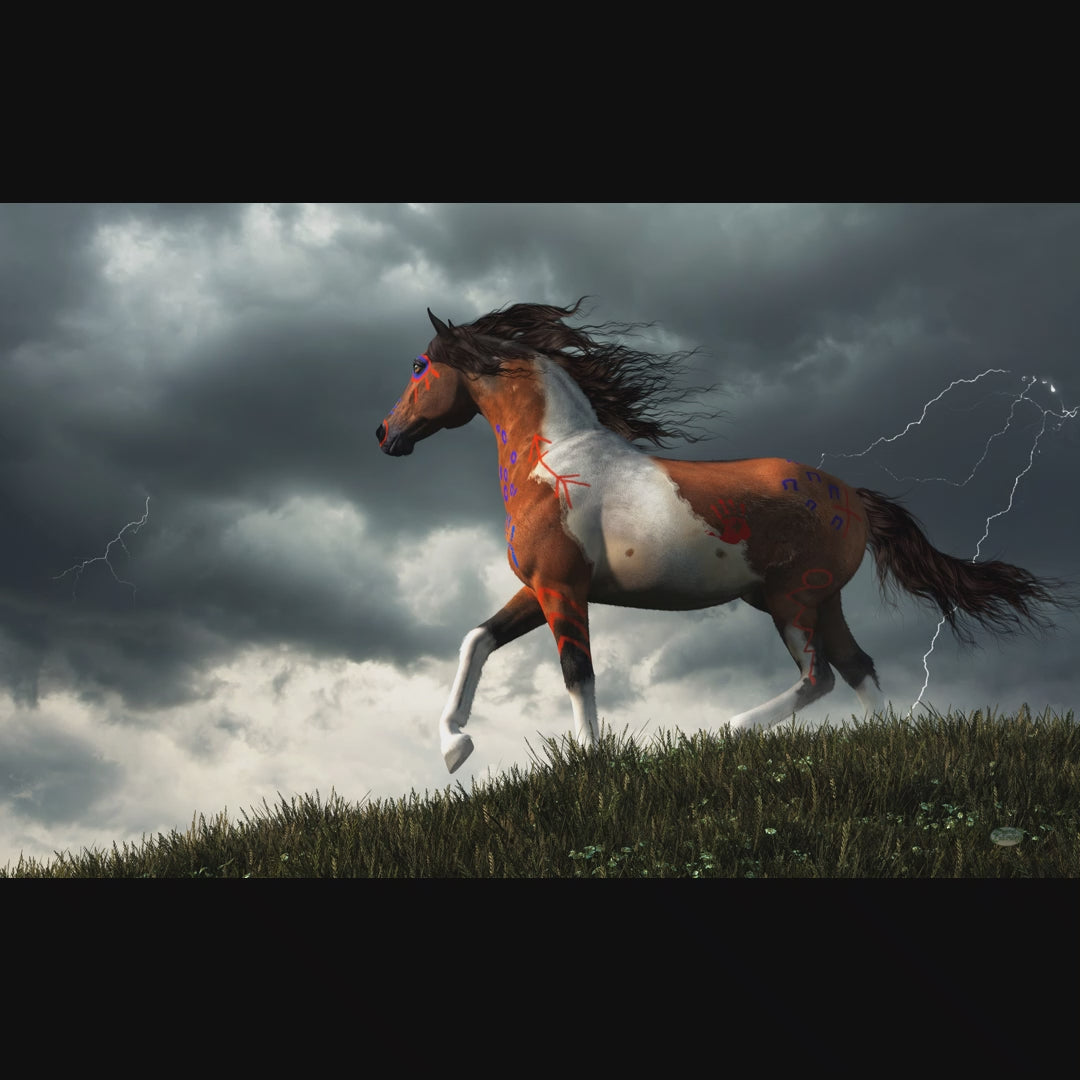 A powerful looking pinto coated horse trots over a grass covered hill in the wilderness of the American Wild West. This equine warrior wears Native American war paint and is ready to bravely face any challenge. A spring storm has just passed through and while lightning strikes in the distance and thunder still booms. a strong wind blows through the animal's dark mane and tail.